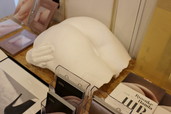 伴田さんが初めてお尻を撮影したモデルから型を取ったという石膏像は、一点もの。お尻に手をそえるのが伴田氏のこだわり。そうすることによって、写真や石膏でありながら柔らかさが表現できるという。