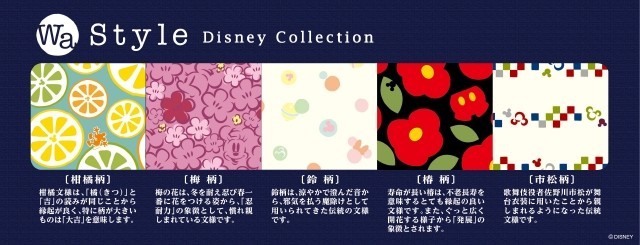 日本の伝統柄や伝統文様をベースに、ディズニーキャラクター「ミッキー」と「ミニー」が隠された和モダンデザインで、パターンは全部で5種類。