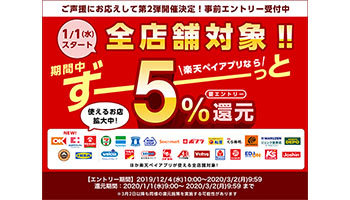 楽天グループの楽天ペイメントは2020年1月1日9時~3月2日9時59分に、同社が運営するスマートフォンアプリ決済サービス「楽天ペイ(アプリ決済)」を導入する全店舗で、「【第2弾】楽天ペイアプリのお支払いで最大5%還元」キャンペーンを実施する。エントリー必須で、12月4日から事前エントリーを受け付けている。
