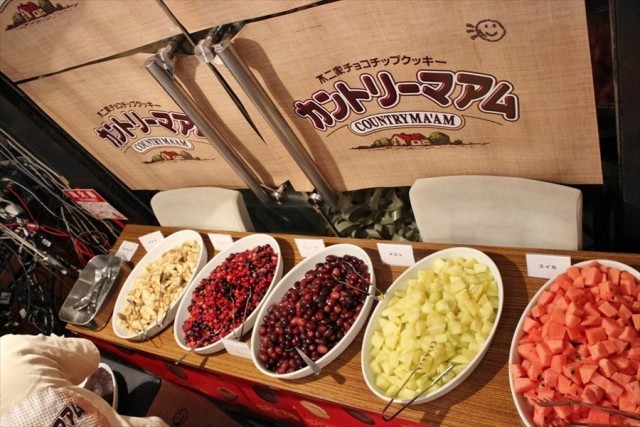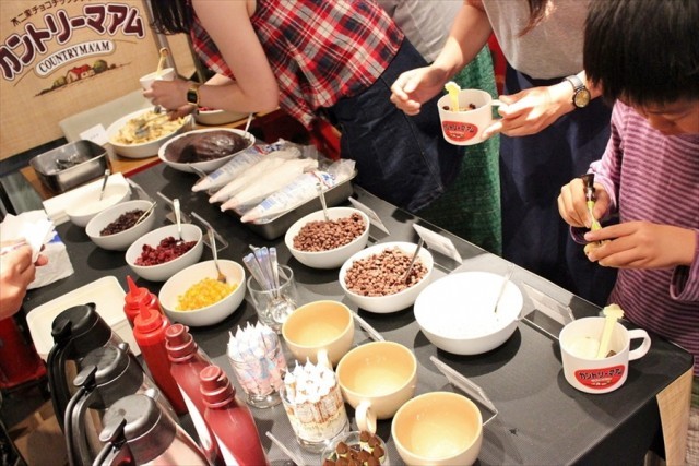 大会後には、参加者全員が各々アレンジレシピに挑戦。フルーツやクリームやチョコレートソースといった定番トッピングに加え、カントリーマアムの母が一押しのあんこや、工場から持ってきたというカントリーマアムに使用しているチョコチップがずらりと並んでいました。