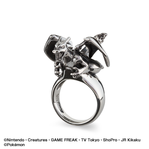 「リザードンリング」は、リザードンが羽を広げ、今にも羽ばたきそうな躍動感あふれるデザインに。尻尾の先が激しく燃え上がり、口から灼熱の炎を吹き出そうとする姿が表現されています。