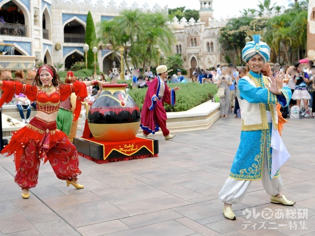 また、東京ディズニーシーの人気アトラクション「マジックランプシアター」のシャバーン様とアシーム、黒魔術師、紳士的な正統派マジシャンが、宮廷の中庭で華やかなマジックを披露してくれます。