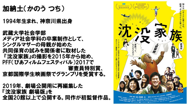 加納:加納土と申します。『沈没家族 劇場版』という映画が、ことしの4月から全国で公開されまして、一通り劇場での公開は終わったぐらいなんですけど。