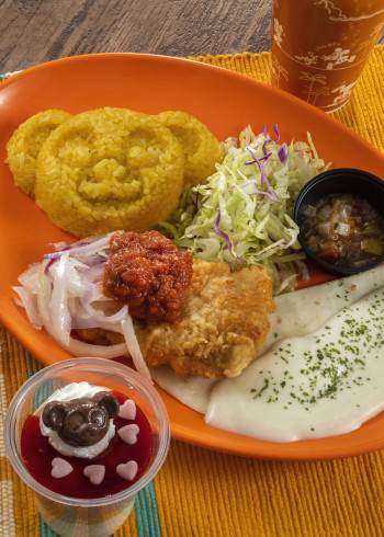 ・フライドチキン(スパイシートマトソース)、エンチラーダ、ターメリックライス、スパイシーサルサ