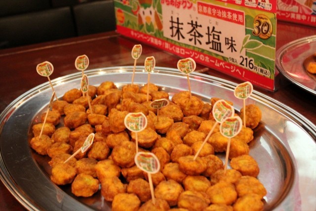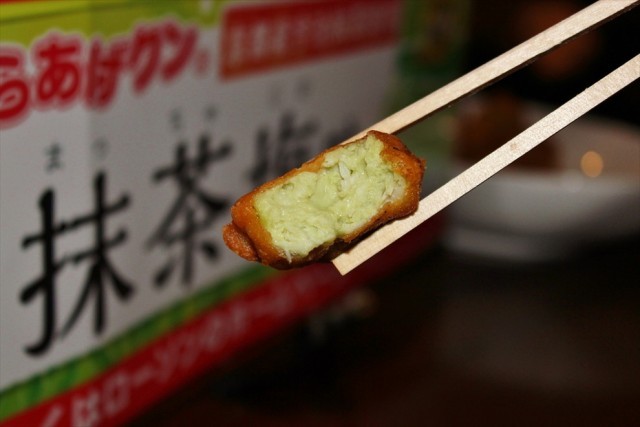 それもそのハズ。今回登場するからあげクンの中にも、佐藤さんいわく「ヤバイ」ものも用意されていたのだ。例えば京都・滋賀・奈良・兵庫エリア限定の「抹茶塩味」は、見た目も緑がかっており、他のからあげクンとは一線を画す存在。中のお肉自体が緑色なのである。