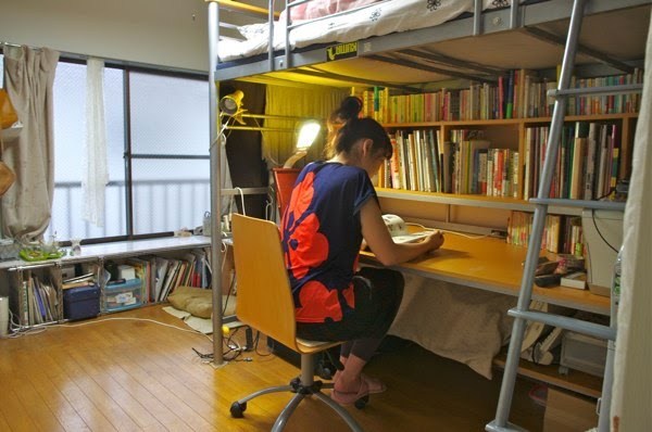 個室を改装できるということで、5人の住人のお部屋を個別に見せてもらうことに。1人目は俳優のIさん。芝居を中心に活動中だ。「壁などに絵を描けるのが楽しいし、色々な人が集まってくるのも面白いなと思って入居しました」。俳優業以外にデザインの仕事もしているので、本棚にはデザイン関係の本がずらり。これぞクリエイターの部屋というべき一室だった。