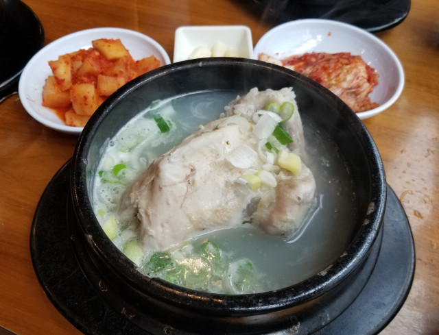 サムゲタンとは内臓を取り去った鶏に、もち米や高麗人参などの漢方材料を詰めて長時間煮たもので、日本の土用の丑の日のウナギのように真夏に食べる。