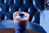 目玉が2個浮かんだグレープ味のソーダドリンク。ブルーベリージュースが入った粒々カプセルが沈んで隠れている。