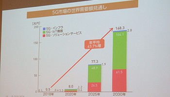 JEITA(電子情報技術産業協会)は12月18日、都内で記者会見を開き、2030年の5Gの世界需要額が168.3兆円になるとの見通しを発表した。内訳は、「データ利活用による5Gのソリューションサービス」が61.5兆円、「IoT機器」が104.1兆円、「インフラ」が2.8兆円とする。18年から30年まで年平均63.7%増で急成長するとの見方を示した。