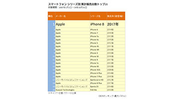 全国の家電量販店の実売データを集計した「BCNランキング」では、08年以降毎年、AppleのiPhoneがキャリア・容量・カラーを合算したシリーズ別集計で年間販売台数No.1を獲得。14年9月19日発売の「iPhone 6」が07年1月の集計開始以来、累計販売台数1位だったが、19年10月までの集計で、17年9月22日発売の「iPhone 8」がiPhone 6を追い抜き、トップに立った。