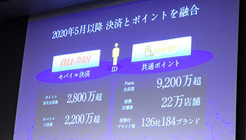 2020年5月以降、決済手段であるau PAYと共通ポイントのPontaは融合する。au PAYのポイント保有会員2800万人と2200万のモバイル口座数が、Pontaの会員9200万人と提携する22万店舗、126社184ブランドと共通のIDでつながる。
