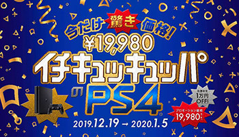 2019年12月19日~20年1月5日の期間、PlayStation 4が数量限定で1万円引きになる「今だけ驚き価格!イチキュッキュッパのPlayStation4!」キャンペーンが始まった。ロード時間を高速化する外付けSSDをあわせて購入しても、元の値段に届かない。空前のお得なキャンペーンだ。