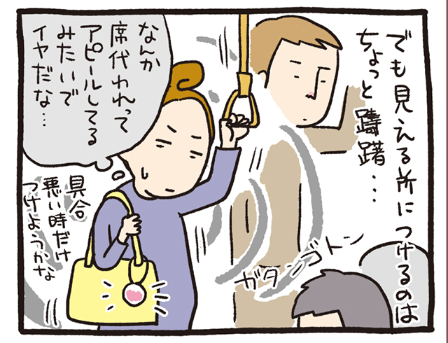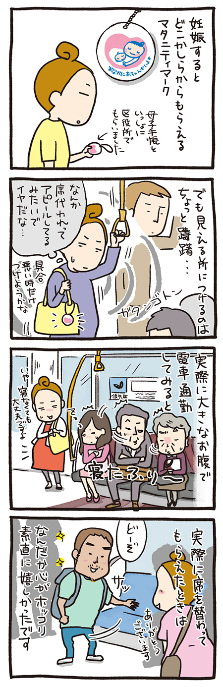 また、妊娠後期はお腹が巨大だったので、マークを身に付けなくても妊婦と気付く人は多く、初めて電車で「寝たふり」に遭遇。あれって、本当に、ドミノ倒しみたいに寝たふりの連鎖が起こるんですね(笑)。