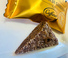 箱を開けると出てくるのは、金のパッケージに入った三角のチョコパイ。何層にも重ねられたパイの間には、濃厚なジャンドゥーヤチョコレートのクリームがイン。