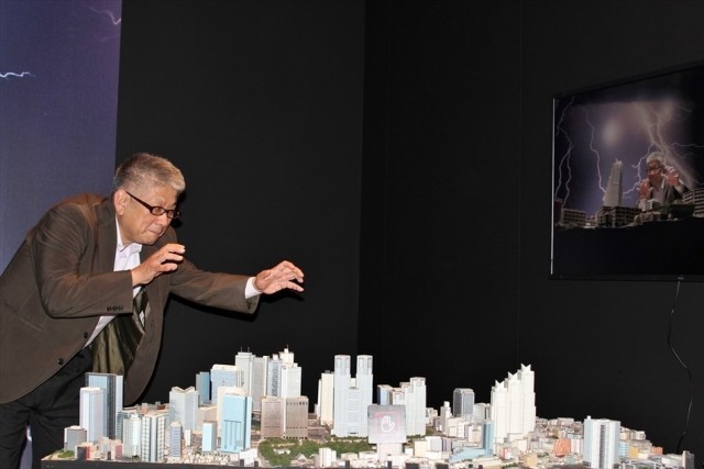 続いての記念撮影コーナーでは、モニターの正面に立ち、都庁などの模型の上から顔を出せば、怪獣になったような映像が画面に映し出される。