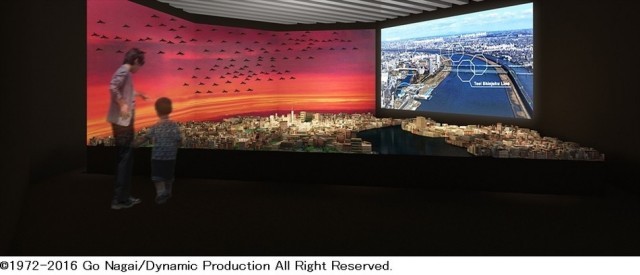 ふたつの巨大スクリーンで映し出されるのは、漫画家・永井豪の描いた不朽の名作『デビルマン』のデーモン軍団大功勢のシーン。そして、『機動警察パトレイバー』などの押井守が監督した短編映像作品『東京スキャナー』である。