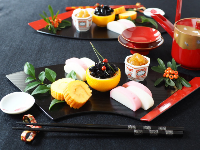 まずは豪華に! 家族みんなで令和初の新年をお祝いするのにふさわしい大皿への盛り付け例です。おせちの具をたくさんと、大皿を用意しましょう。