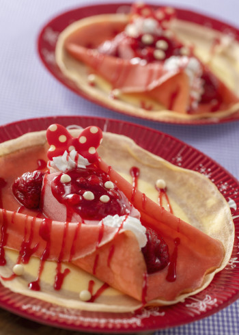 ちなみに「カフェ・オーリンズ」では、通常メニューの「ストロベリー&クランベリークレープ」にも「ミニーリボン」が乗っています。