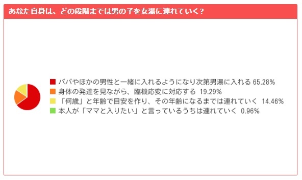 多数を占めたのは「パパやほかの男性と一緒に入れるようになり次第男湯に入れる」65.28%。「『何歳』と年齢で目安を作り、その年齢になるまでは連れていく」14.46%の4倍以上です。