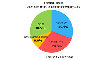 年末の大掃除需要で沸くLED電球市場で、今年もパナソニックとアイリスオーヤマの激しいバトルが繰り広げられている。全国の主要家電量販店・ネットショップのPOSデータを集計した「BCNランキング」で年間販売台数No.1ベンダーを称える「BCN AWARD 2019(2018年1月1日~12月31日)」では、アイリスオーヤマが初のトップに輝いたのだが、今年は1月1日~12月15日時点でパナソニックが30.6%で再び首位に立っている。追う立場のアイリスオーヤマは29.8%で、わずか0.8ポイント差。2社の戦いは、大詰めを迎えている。