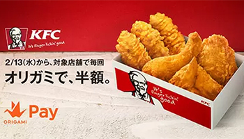 2月13日から2月19日まで実施となったOrigamiのキャンペーン「オリガミで、半額。」第三弾。Origami Pay導入する116店舗で、ケンタッキーフライドチキンが半額になるということで、関心が高まった。