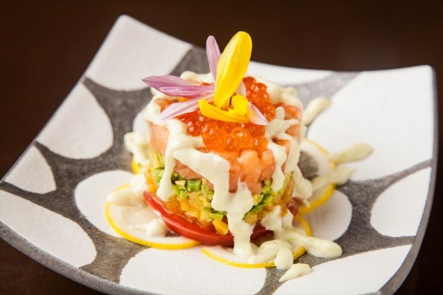 新撰組の「鬼の副長」土方歳三の刀。好物だったとされる沢庵を使い、アボカドとサーモンのタルタルを和風に仕上げました。