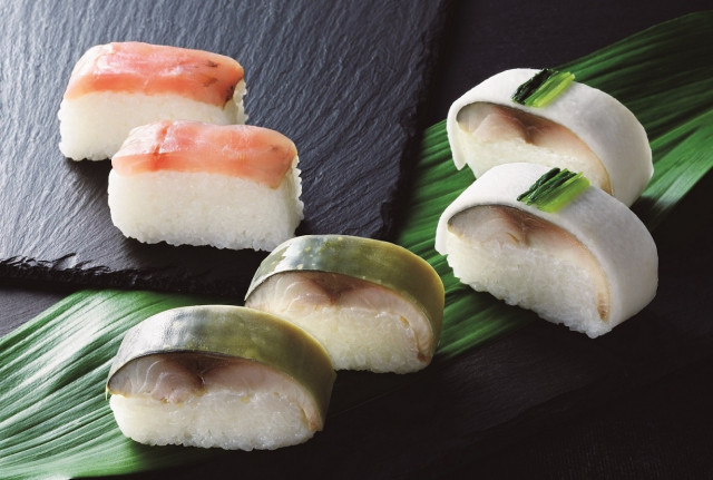 脂ののった鯖に千枚漬けをのせた鯖寿しや、若狭ぐじの押寿しを一折りに。