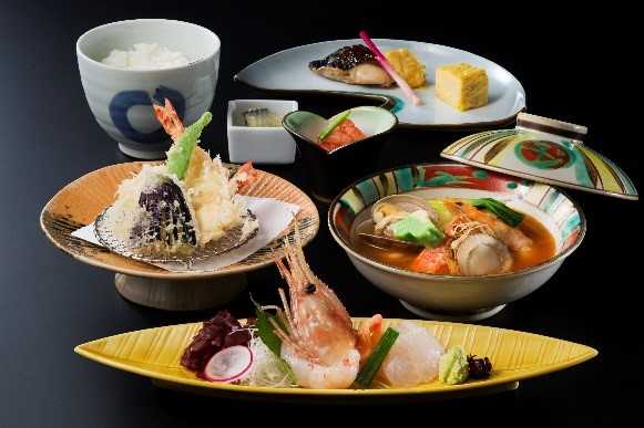 海の幸の中でも皆様が好きな海老尽くしの御膳を。雪景色の日本庭園を眺めながら堪能できます。
