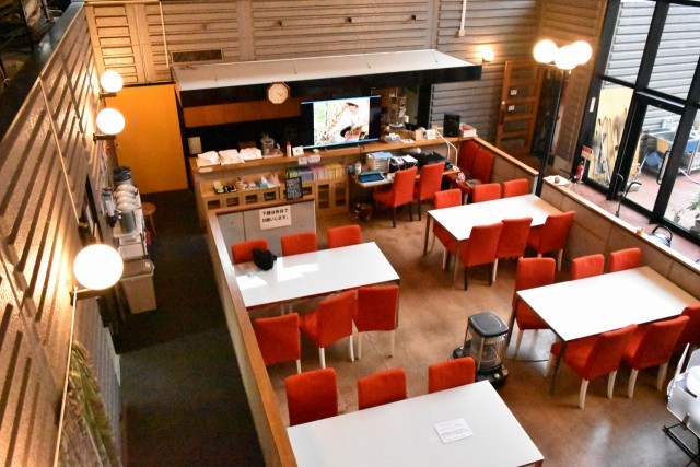 食堂は天井が高く、広々していて、元体育館だったのかなという感じ。