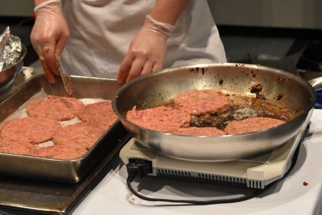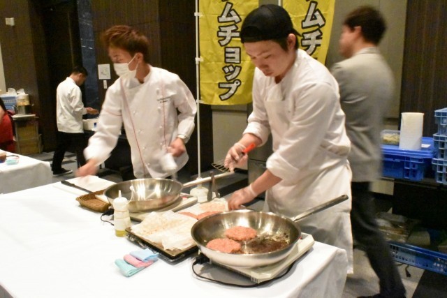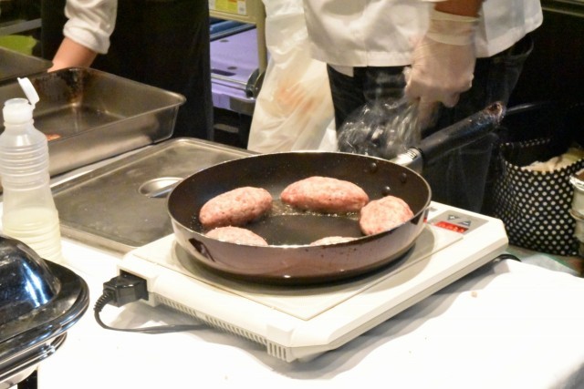フライパンの中で肉汁がジュワ~!!っと弾け、いい音が会場に響きます。