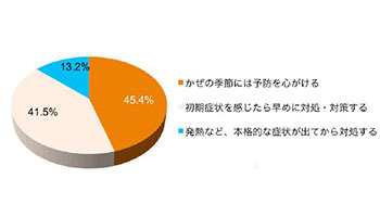 ただし、女性は「かぜの季節には予防を心がける」の方が高い。反対に、男性は「初期症状を感じたら早めに対処・対策する」が高かったほか、「発熱など、本格的な症状が出てから対処する」が女性に比べて高かった。症状が本格的になって、やっと対策に乗り出す男性は少なくないようだ。