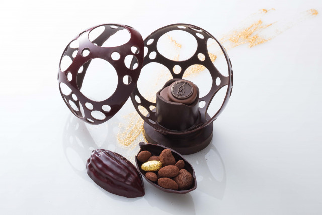 「星からの贈り物 ~Hommage de l'étoile~」はアーティスティックで繊細な球形のチョコレートの中にカカオの実を表現したチョコレートと、その中にはカカオ豆に見立てたアーモンドとマカダミアナッツチョコレートが入っている「作品」とも呼べる商品です。