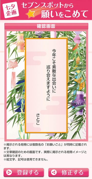 短冊に願いごとを託すのはご利益ありそうだけど、私は神社にひとりで行くのがちょっと照れくさいな……という人には嬉しいサービス。神社まで行く時間がない……という人も、近くのセブン-イレブンで投稿できるので便利ですよ!