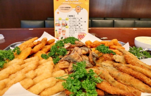 次は「シーフードフライ盛り合わせ」。「白身魚フライ」「さば竜田揚げ」「イカフライ」はこの日に発売された新商品。添えられたタルタルソースも、ローソンストア100で販売されているマヨネーズや卵を使って作られているというから驚き。「イカフライ」は、思ったよりもイカが柔らかくて食べやすかった。
