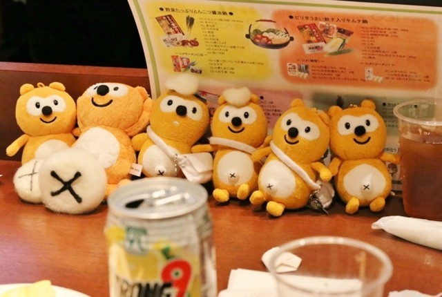 テーブルの上に並べられたポンタを発見。運営側が用意したディスプレイなのかと思っていたら、なんと参加者の私物! しかも良く見るとノベルティのポンタに混じって、手作りのポンタもいるのが驚きだった。ポンタ愛が伝わってくる。