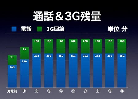 バッテリー残量については、充電前の20%から15分の充電で、8-10%上昇しました。通話と3G通信については、充電前には電話が168分、3G回線が72分でしたが、①をのぞいて、電話252分、3G回線が108分に増加。15分の充電で電話が+約100分、3G回線が+約30分と緊急時の手助けには十分な数値ではないでしょうか※5。バッテリー残量には2%ほど開きがありましたが、通話&3G残量では実際では同じ値を示していますので、製品による差はほぼないといえるのではないでしょうか? 今回実験したコンビニでは、差はあまりないようです。