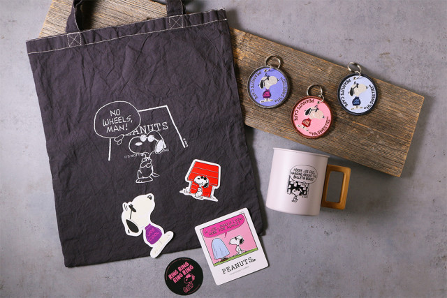 トートやステッカーなどジョー・クールに変装したスヌーピーと一緒におでかけできるアイテムがラインナップされています。