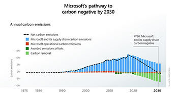 日本マイクロソフトは1月16日にサティア・ナデラCEOが、1975年の創業以来排出してきたCO2を2050年までにすべて回収すると発表した施策で、まずは30年までの「カーボンネガティブ(直接・間接的なCO2排出量を半減して排出量以上を除去する)」の実現に向けた具体策を発表した。1月21日に、ブラッド スミス社長のブログの抄訳として発表した。