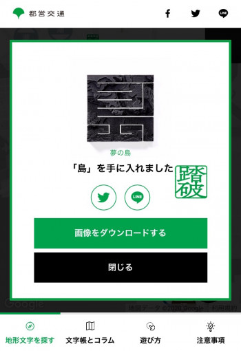 地形由来の文字が名称に含まれるバス停を通ったら、画面をタップすると、その場で江戸文字をゲット!