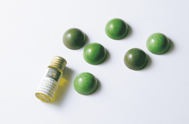 フランボワーズエストラゴン風味、柚子、新作のストロベリーミントなどを合わせた、個性の違う3種のオリーブを使用したホワイトショコラガナッシュ
