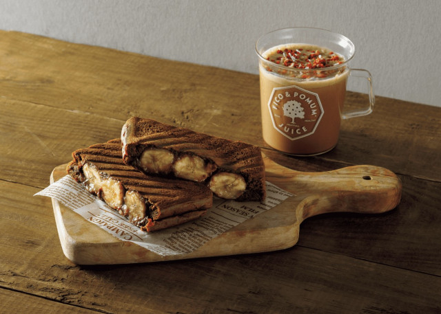 〈FICO&POMUM JUICE〉有機カカオとキャロブのホットミルク 605円(1杯)、有機チョコのバナナフィグホットサンド 605円(1人前)