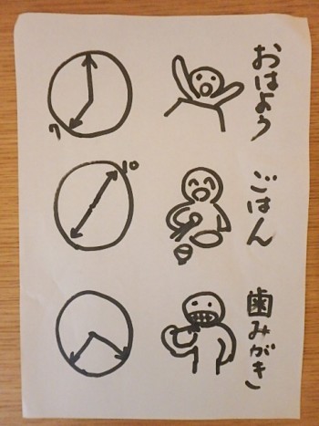 学校の時間割のように次のように書いておきます。横に時計の絵をかいておくと、ついでに時計も読めるようになります。