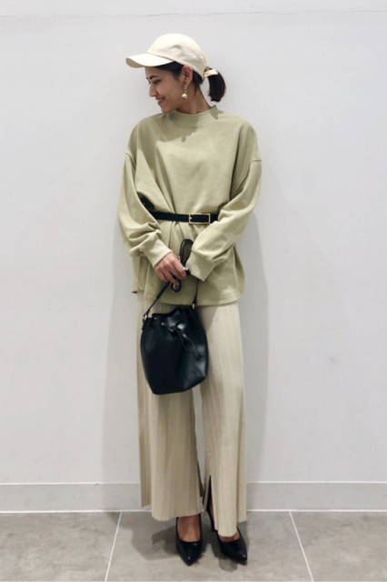 ピスタチオグリーンのワントーンコーデは、小物にブラックを使いメリハリを