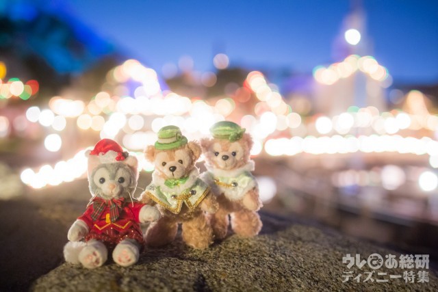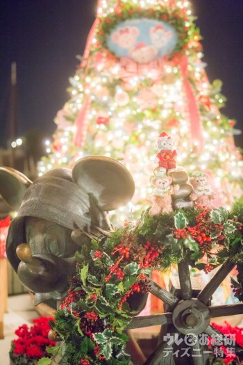 ミッキー像と一緒に旅するダッフィーたちがかわいい