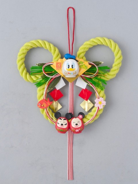 ミッキーだるま、ミニーだるまに加え、ドナルドだるまが付いたしめ飾り。