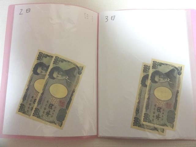 (1)クリアブックの各日付のポケットに1日の予算(2,000円)を入れる