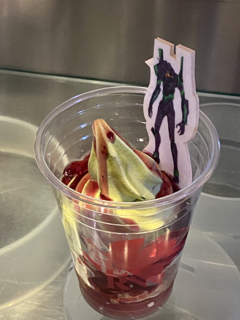 そして、ファストフード「フォンターナ」には、綾波レイの大好物「にんにくラーメンチャーシュー抜き~綾波レイ~」や、抹茶ソフトとベリーのソースで初号機カラーをイメージした「エヴァンゲリオン初号機サンデー」、レイやアスカ、ミサトにちなんだドリンクなど計6品を提供。