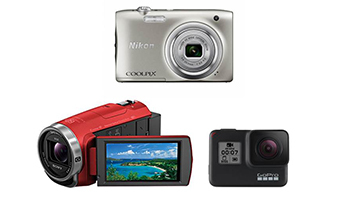 2019年撮影機器販売台数BEST3、左から2位のソニー「HDR-CX680」、1位のニコン「COOLPIX A100」、3位のGoPro「HERO 7 Black」