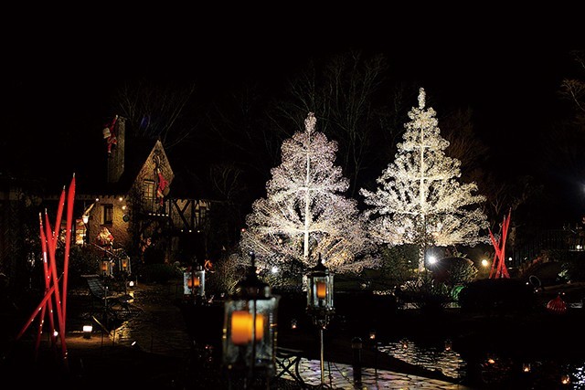 テラスや橋など庭園の様々な場所に無数のキャンドルが置かれ、冬景色を温かみあふれる風景に演出する。