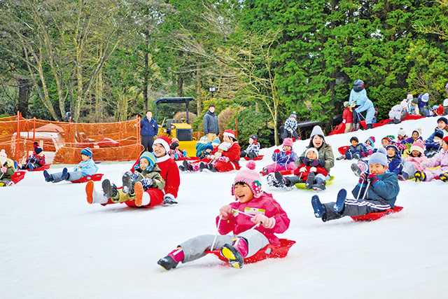箱根園では冬季限定で雪遊びが楽しめる広場がオープン。ゲレンデでは専用コースでそり滑りができるほか、広場では雪だるまづくりや雪合戦もできるので、雪遊びを存分に満喫できる。